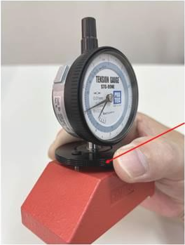 在网版上施予ㄧ定的重量/下压力,所产生的微小位移量/刻度值,透过数位式仪器将位移量进行精密检测,读取网版张力测定值。